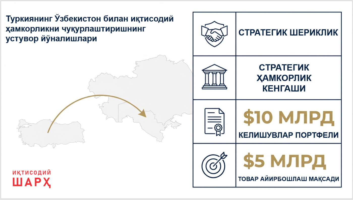 2023 yilda Turkiya Prezidentining O‘zbekistonga rasmiy tashrifi davomida keng ko‘lamli O‘zbekiston-Turkiya biznes-forumi o‘tkazildi va qariyb 10 mlrd. dollarlik hujjatlar imzolandi. 2024 yilda esa O‘zbekiston Prezidentining Turkiyaga rasmiy tashrifi davomida Strategik hamkorlik kengashining uchinchi yig‘ilishi hamda O‘zbekiston-Turkiya Ishbilarmonlar kengashining birinchi yig‘ilishi bo‘lib o‘tdi va keng qamrovli strategik sheriklikni chuqurlashtirish to‘g‘risidagi deklaratsiya imzolandi.