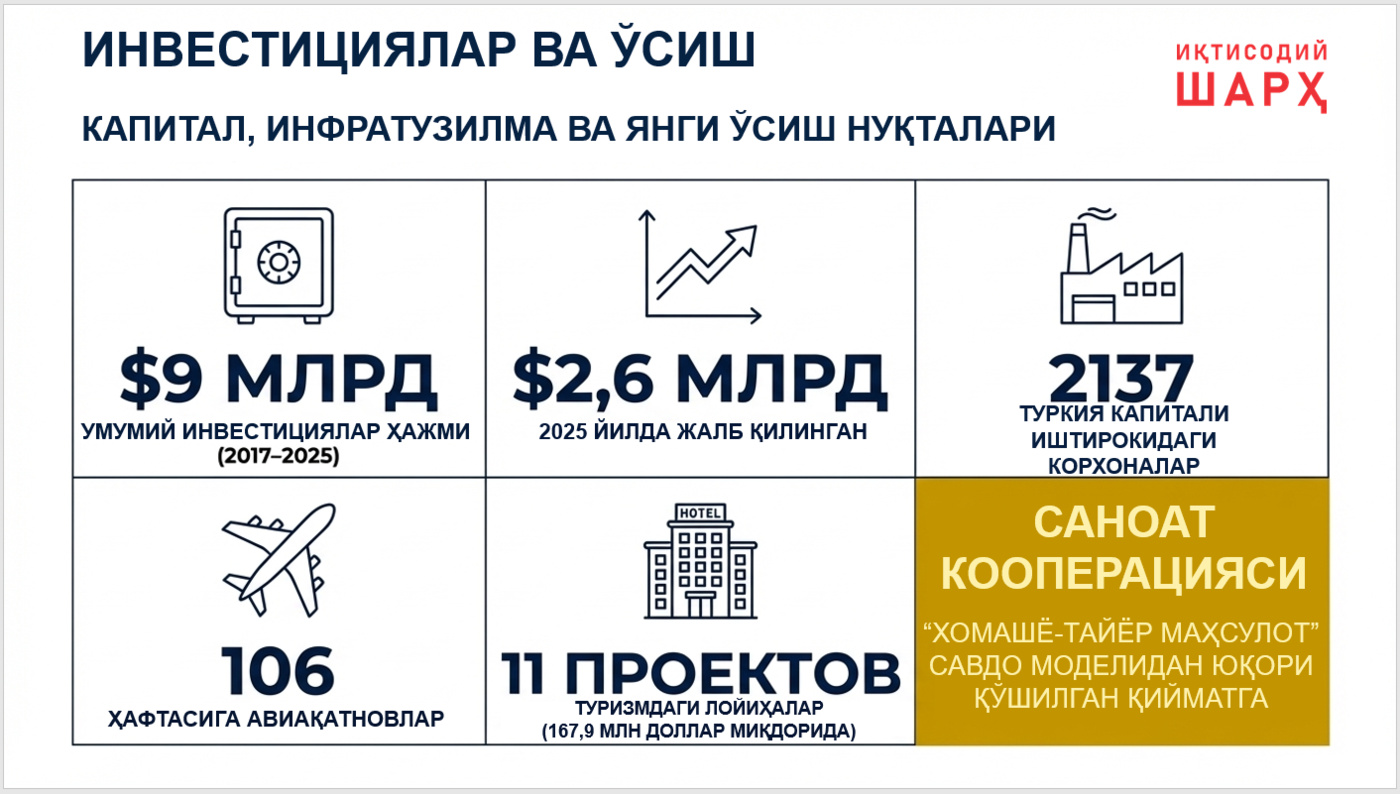 O‘zbekistonvaTurkiyao‘rtasidaInvestitsiyalarnio‘zarorag‘batlantirishvahimoyalashto‘g‘risidabitimimzolangan. 2017-2025 yillardavridaTurkiyadanO‘zbekistoniqtisodiyotigakiritilganto‘g‘ridan-to‘g‘riinvestitsiyalarvakreditlarningumumiyhajmi 9 mlrd. dollarnitashkiletdi, shundan 2,6 mlrd. dollar 2025 yildajalbqilingan.