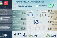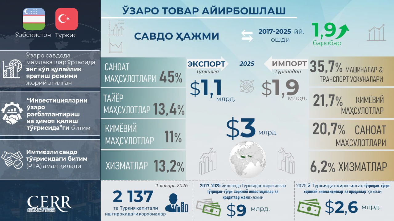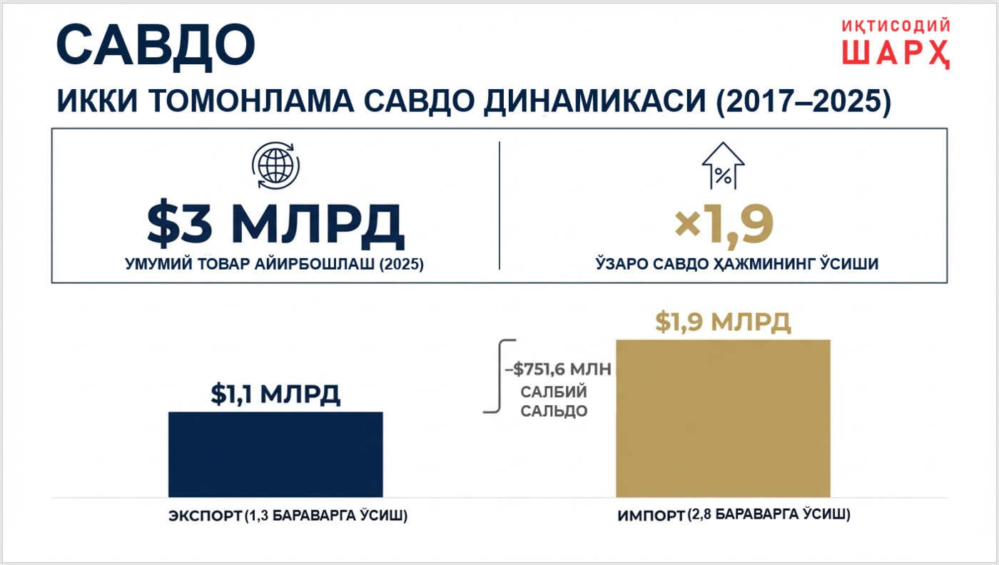 2017–2025 yillar davrida ikki mamlakat o‘rtasidagi o‘zaro savdo hajmi 1,9 baravarga oshib, 2025 yil oxirida 3 mlrd. dollarni tashkil etdi, Turkiyaga eksport 1,3 baravarga o‘sib, 1,1 mlrd. dollarga yetdi, Turkiyadan import 2,8 baravar ko‘payib, 1,9 mlrd. dollarni tashkil qildi. Shu bilan birga, o‘zaro savdoda Turkiyadan importning yillik o‘sish sur’ati Turkiyaga eksportning o‘sish sur’atidan oshib ketdi va bu salbiy saldoning -751,6 mln. dollargacha oshishiga olib keldi.
