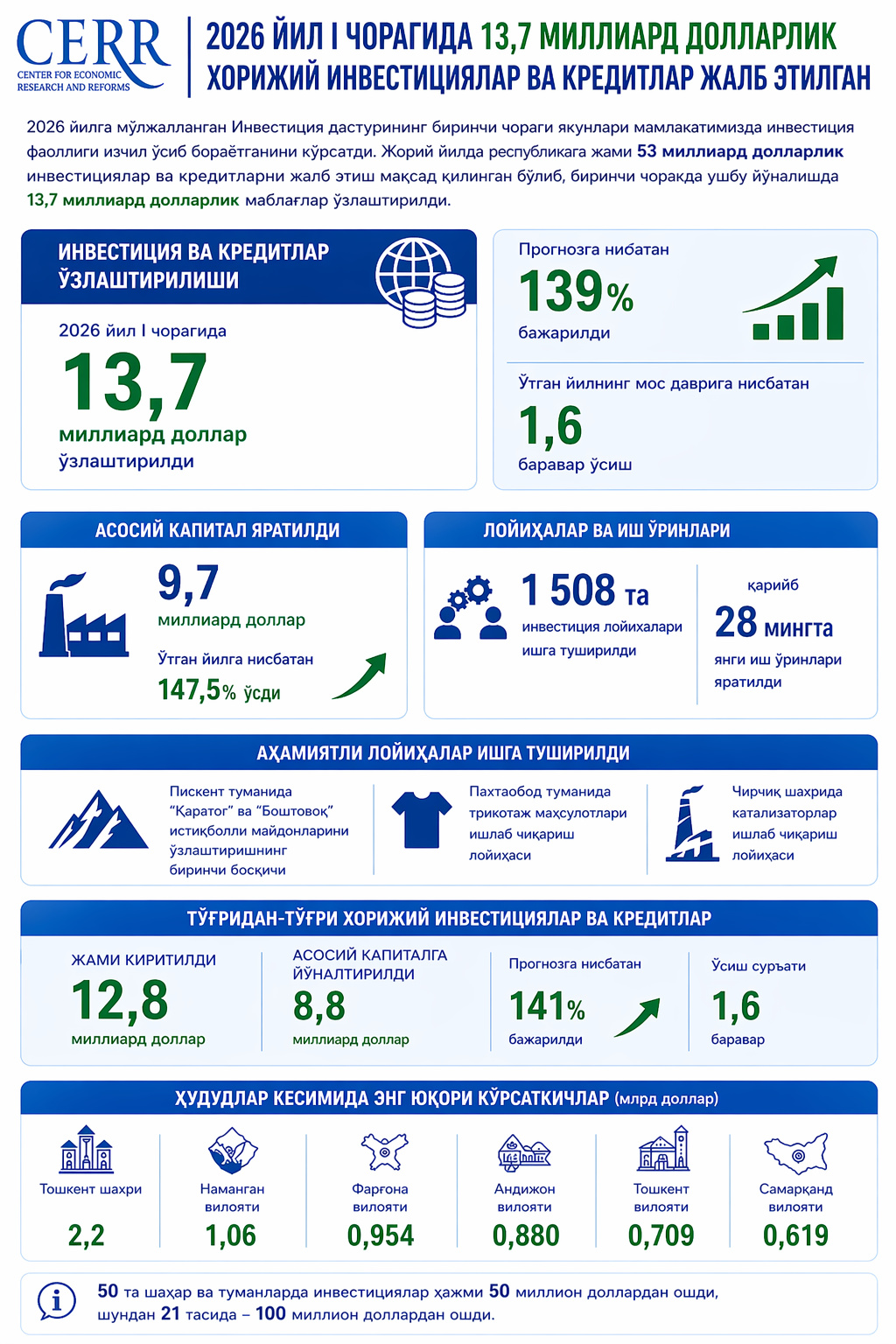 Hisobot davrida 50 ta shahar va tumanlarda o‘zlashtirilgan investitsiyalar hajmi 50 million dollardan oshgan bo‘lib, ularning 21 tasida ushbu ko‘rsatkich 100 million dollarga yetdi. Bu ko‘rsatkichlar hududlarda investitsiya faolligi kengayib borayotganini ko‘rsatadi.