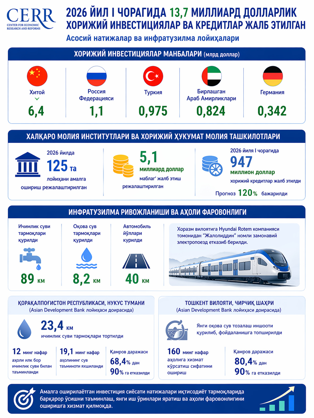Investitsiya loyihalari doirasida infratuzilmani rivojlantirish va aholi turmush sharoitlarini yaxshilash bo‘yicha aniq natijalarga erishildi. Xususan, Xorazm viloyatiga Koreyaning Hyundai Rotem kompaniyasi tomonidan “Jaloliddin” nomli zamonaviy elektropoyezd yetkazib berildi. Bu aholi uchun qulaylik yaratib, safar vaqtining 18 soatdan 7 soatgacha qisqarishiga xizmat qiladi.