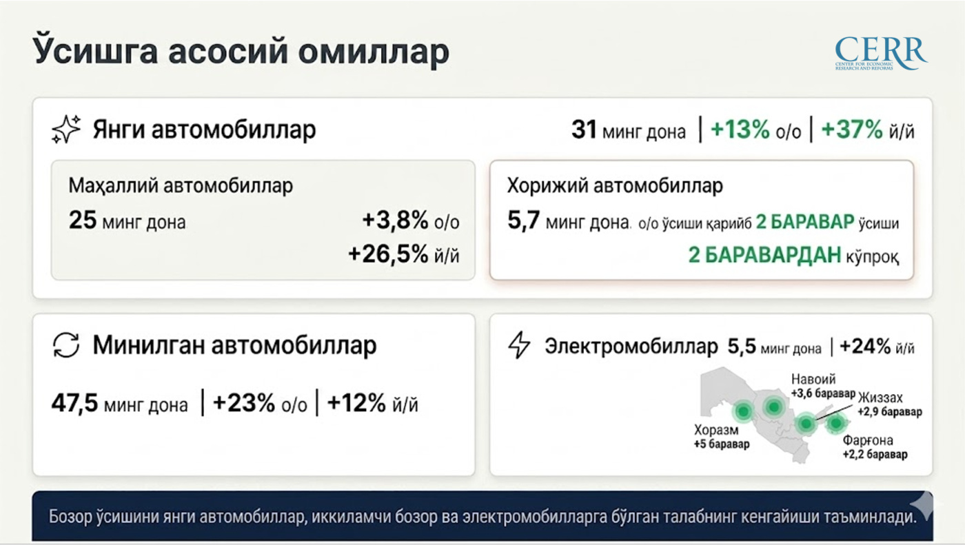 Маҳаллий ишлаб чиқарилган янги енгил автомобиллар сегментида савдо ҳажми 25 мингтага етган. Бу бир ойда 3,8 фоизга, ўтган йилнинг шу даврига нисбатан эса 26,5 фоизга ўсган.