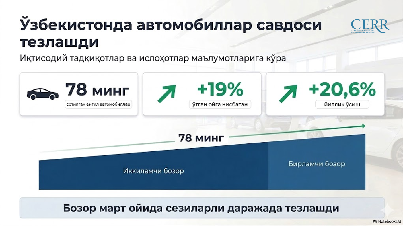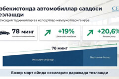 Март ойи якунларига кўра, бирламчи ва иккиламчи бозорларда жами 78 мингдан ортиқ енгил автомобил сотилган. Бу ўтган ойга нисбатан 19 фоизга кўп. Йиллик ҳисобда эса савдо ҳажми 20,6 фоизга ошган.