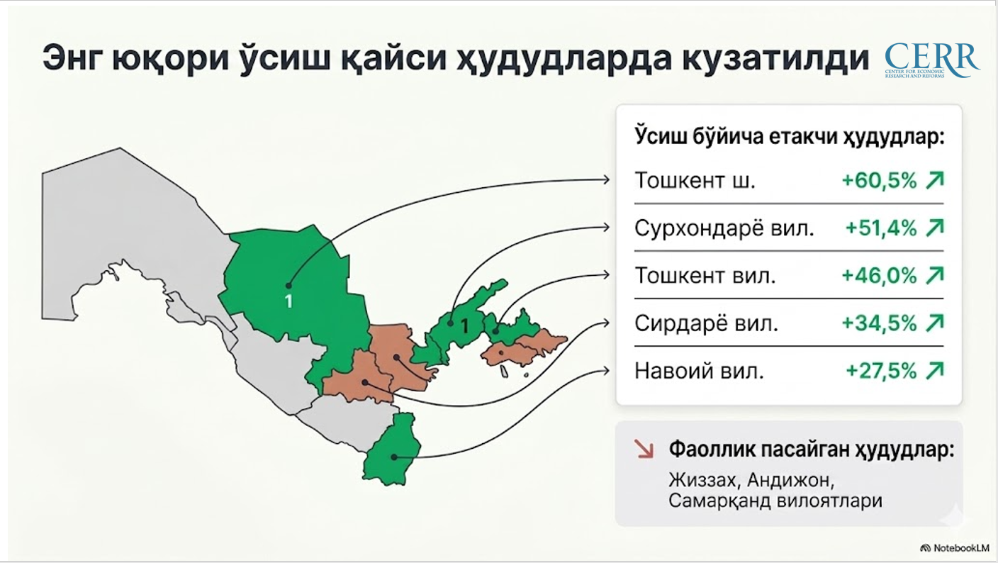 Энг юқори ўсиш Хоразм вилоятида кузатилиб, бу ерда савдо 5 бараварга ошган. Шунингдек, Навоий вилоятида 3,6 баравар, Жиззах вилоятида 2,9 баравар ва Фарғона вилоятида 2,2 баравар ўсиш қайд этилган.