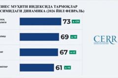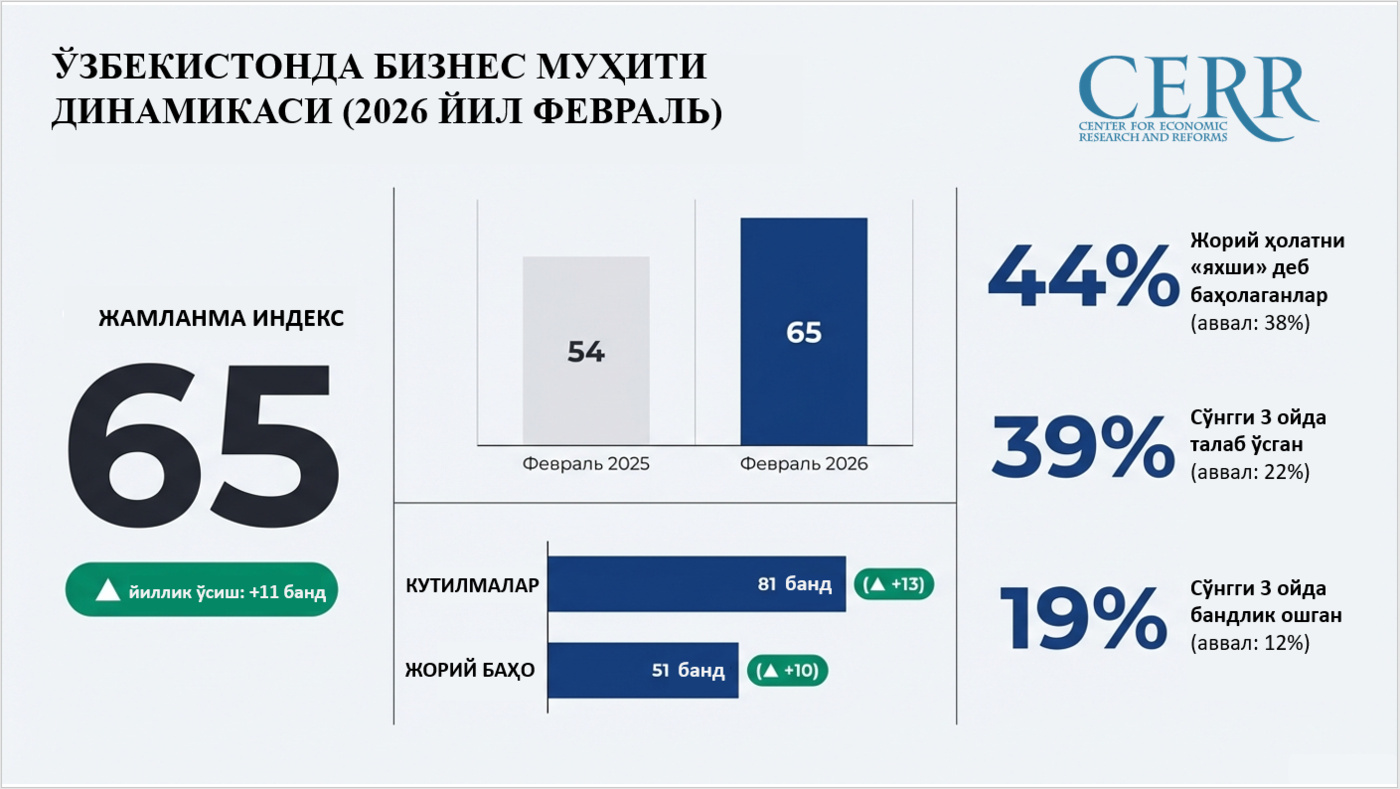 2026 yil fevral oyi yakunlariga ko‘ra, jamlanma biznes muhiti indeksi (-100 dan +100 gacha bo‘lgan shkalada) 65 bandni tashkil etib, o‘tgan yilning mos davriga nisbatan 11 bandga yuqori bo‘lgan.